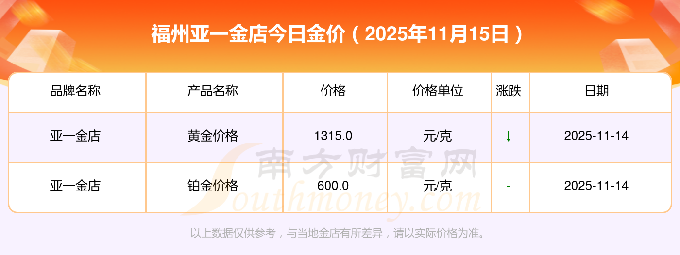 今天黄金价位是多少?现在一克黄金的价格是多少呀?2025年11月15日福州亚一金店今日价格:黄金价格1333.0元/克,铂金价格646.0元/克,饰品金价(内地)1333.0元/克,黄金饰品(香港)46320.0,铂金价格(香港)18410.0,金条价格(香港)41780.0,金条金价(内地)1167.0元/克,黄金价格1322.0元/克,铂金价格600.0元/克,足金价格1322.0元/克,黄金价格1295.0元/克。