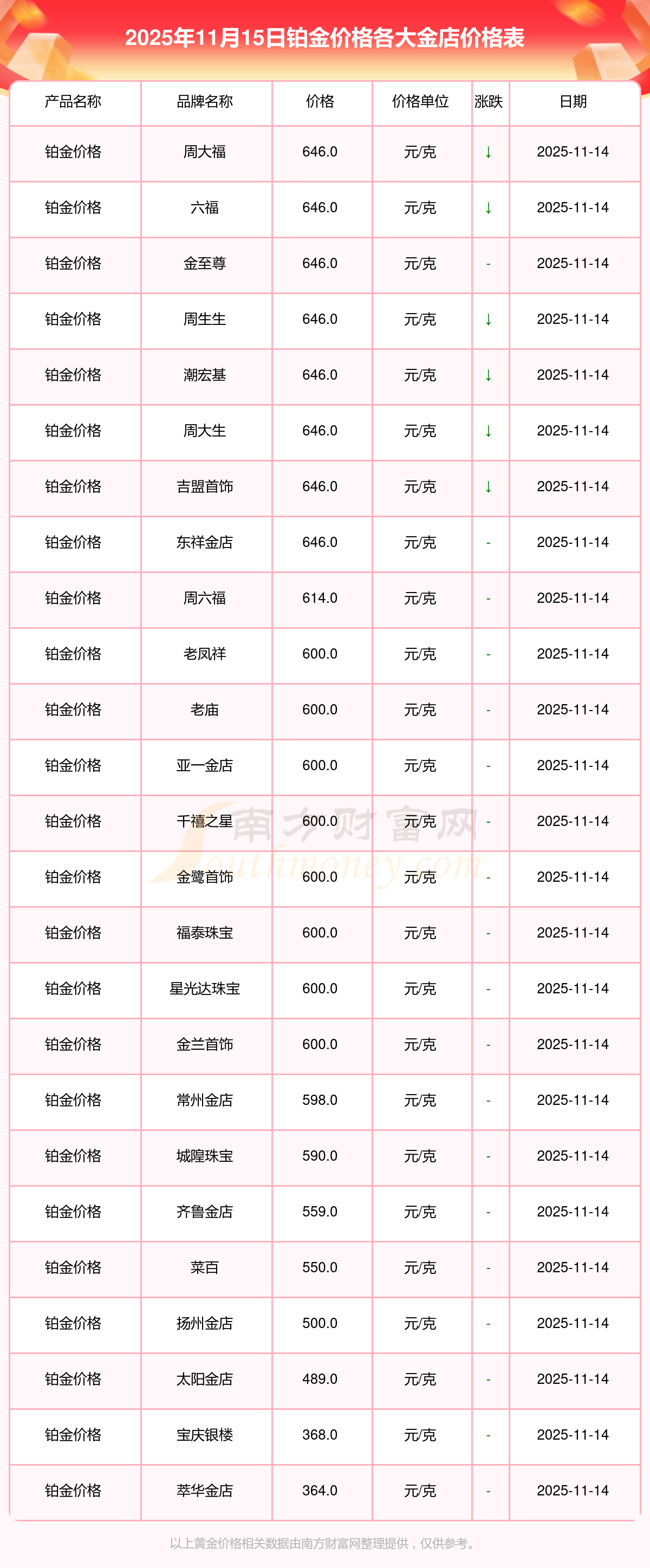今天是2025年11月15日,周大福、周大福、周大福、周大福、周大福、周大福、周大福、老凤祥、老凤祥、老凤祥、周六福等各大金店品牌铂金价格最新价格如下:周大福1333.0元/克、周大福646.0元/克、周大福1333.0元/克、周大福46320.0、周大福18410.0、周大福41780.0、周大福1167.0元/克、老凤祥1322.0元/克、老凤祥600.0元/克、老凤祥1322.0元/克、周六福1295.0元/克。