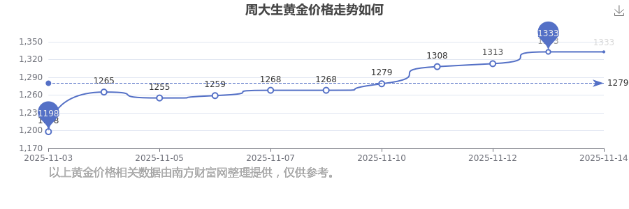 想知道今日黄金价格,目前黄金一克的价钱是多少呀?一克黄金的价格会是多少呢?今日周大生 黄金价格最新的克重售价为1333.0元/克。