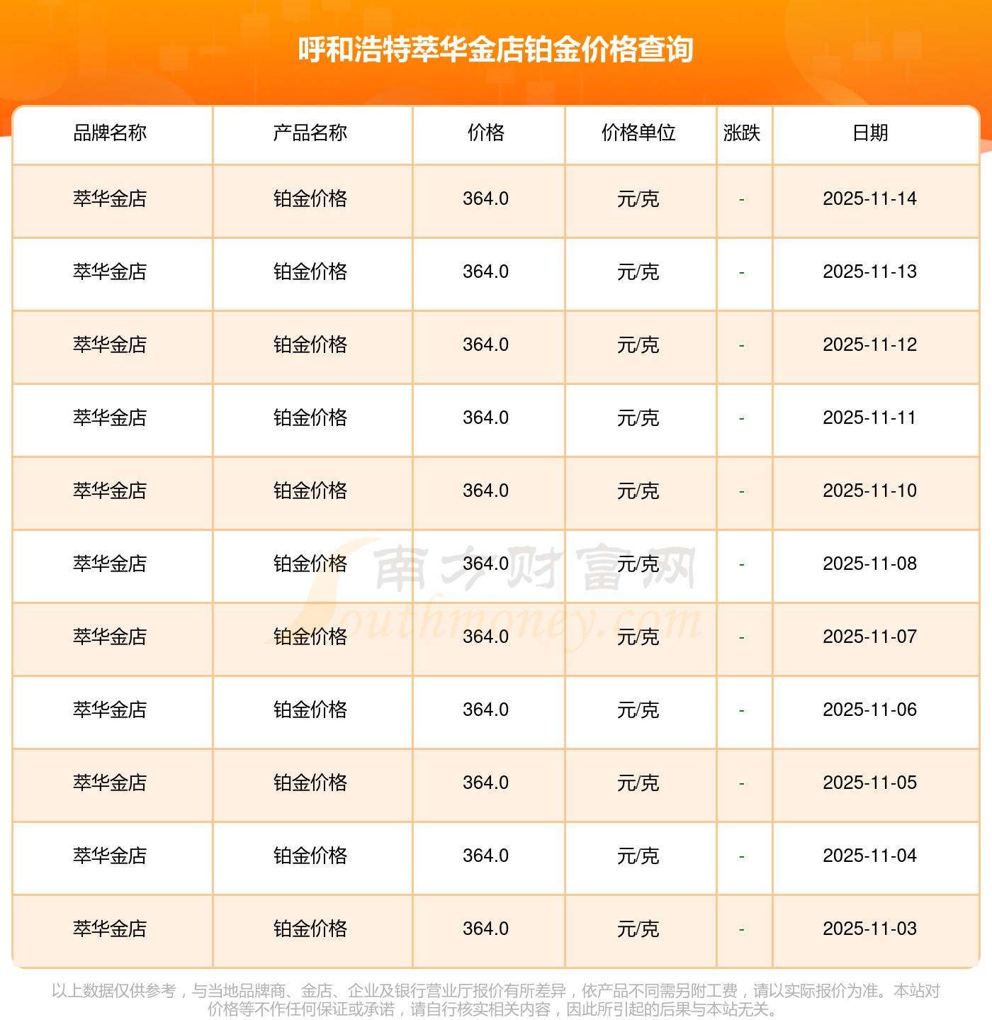 呼和浩特萃华金店的铂金价格在今日(2025年11月15日),每克售价为364.0元/克。