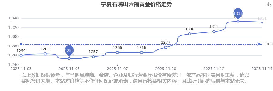 今日(2025年11月15日)宁夏石嘴山六福黄金价格:1331.0元/克。