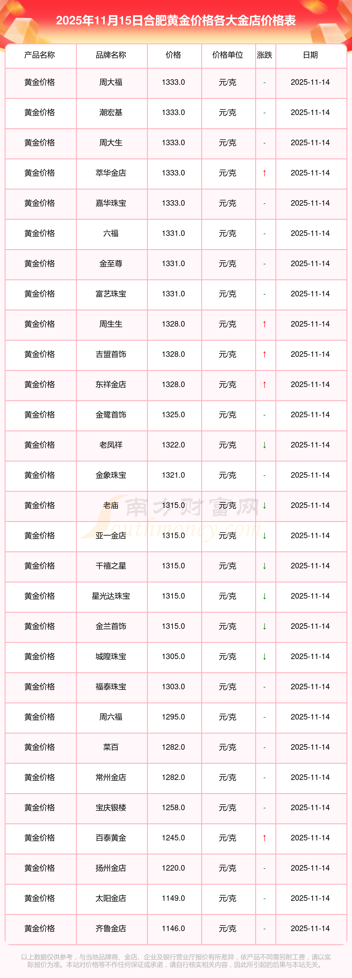 2025年11月15日合肥周大福、周大福、周大福、周大福、周大福、周大福、周大福、老凤祥、老凤祥、老凤祥、周六福等各大金店品牌黄金价格最新价格行情来了,如下:周大福黄金价格1333.0元/克,周大福铂金价格646.0元/克,周大福饰品金价(内地)1333.0元/克,周大福黄金饰品(香港)46320.0,周大福铂金价格(香港)18410.0,周大福金条价格(香港)41780.0,周大福金条金价(内地)1167.0元/克,老凤祥黄金价格1322.0元/克,老凤祥铂金价格600.0元/克,老凤祥足金价格1322.0元/克,周六福黄金价格1295.0元/克。