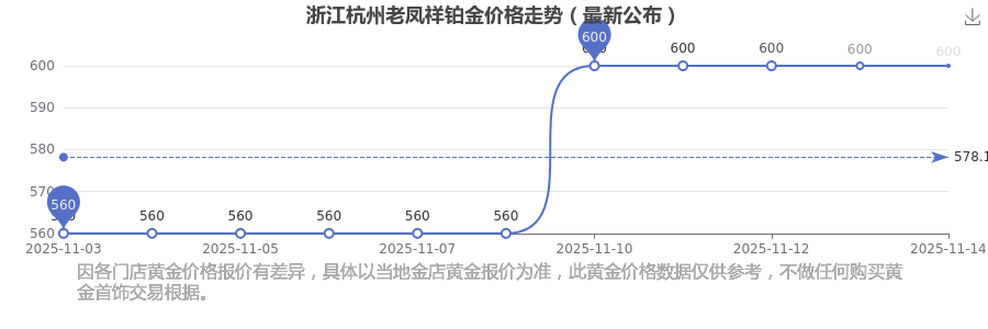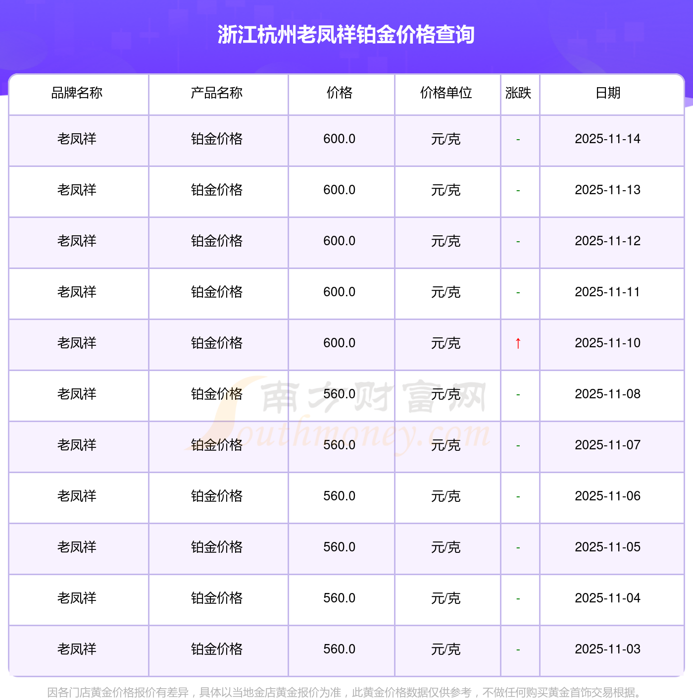 今日(2025年11月15日),600.0元/克是浙江杭州老凤祥铂金价格的价格标准。