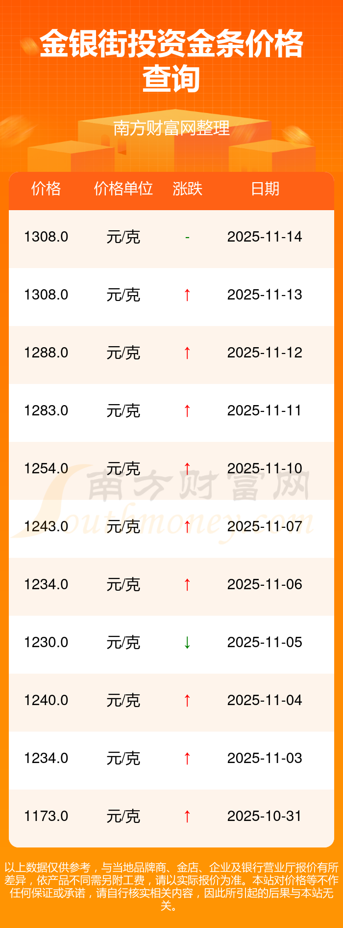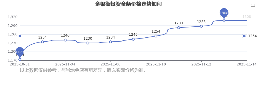 今日(2025年11月15日),金银街投资金条最新价格是1308.0元/克。