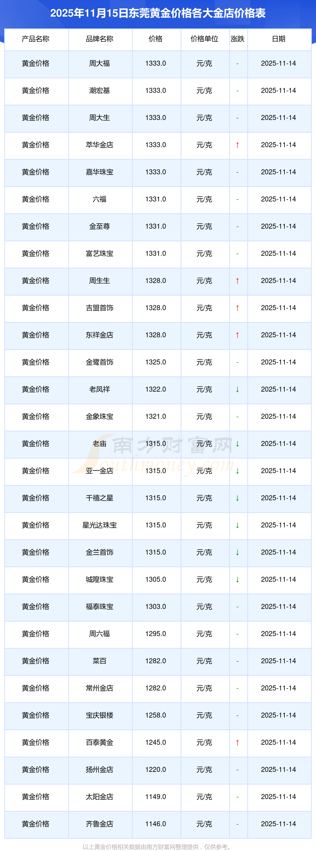 2025年11月15日东莞周大福、周大福、周大福、周大福、周大福、周大福、周大福、老凤祥、老凤祥、老凤祥、周六福等各大金店品牌黄金价格最新价格如下:周大福黄金价格1333.0元/克,周大福铂金价格646.0元/克,周大福饰品金价(内地)1333.0元/克,周大福黄金饰品(香港)46320.0,周大福铂金价格(香港)18410.0,周大福金条价格(香港)41780.0,周大福金条金价(内地)1167.0元/克,老凤祥黄金价格1322.0元/克,老凤祥铂金价格600.0元/克,老凤祥足金价格1322.0元/克,周六福黄金价格1295.0元/克。