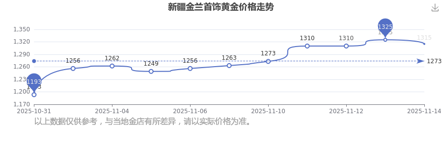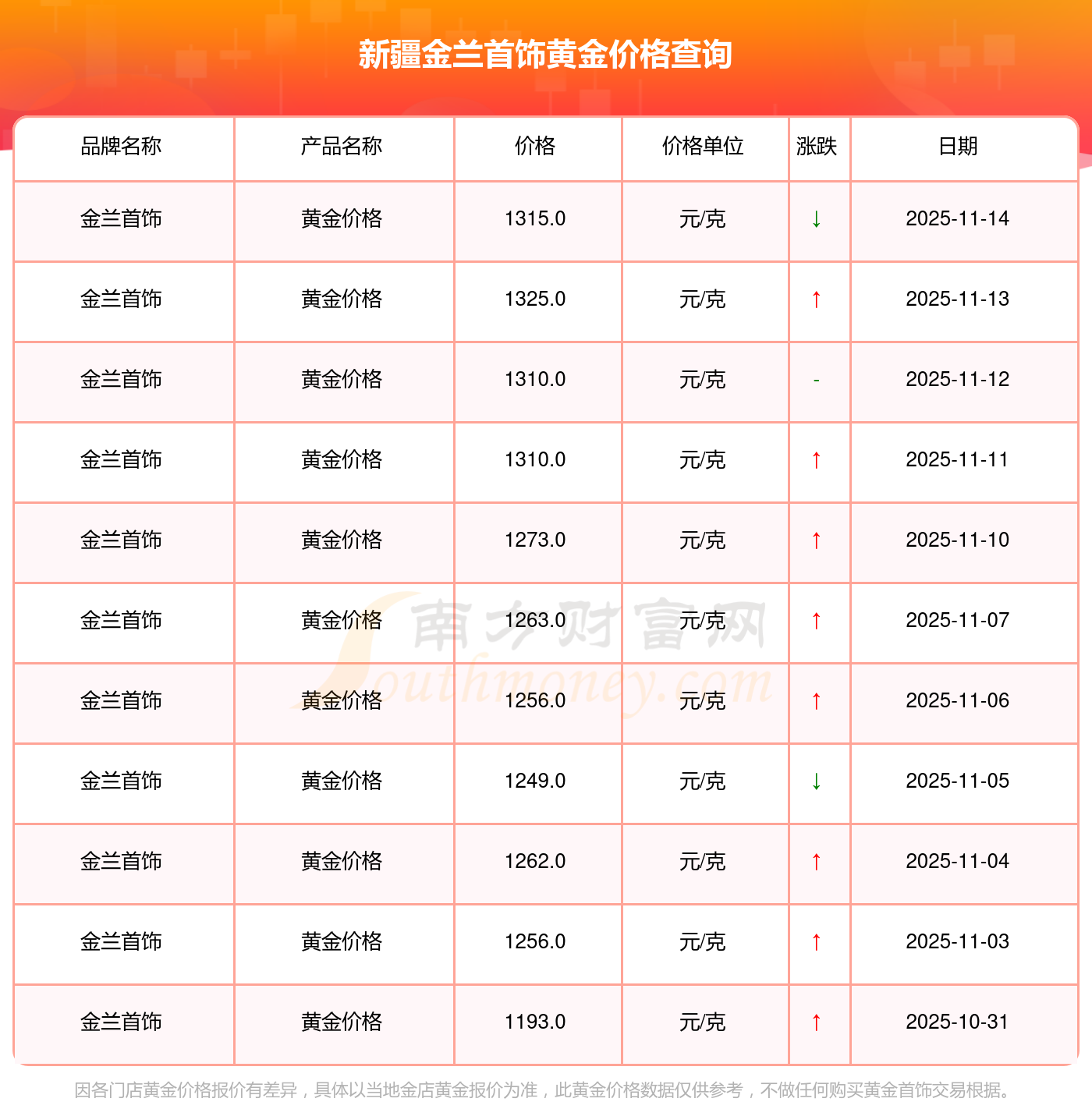 2025年11月15日当天,新疆金兰首饰黄金价格的单价是 1315.0元/克。