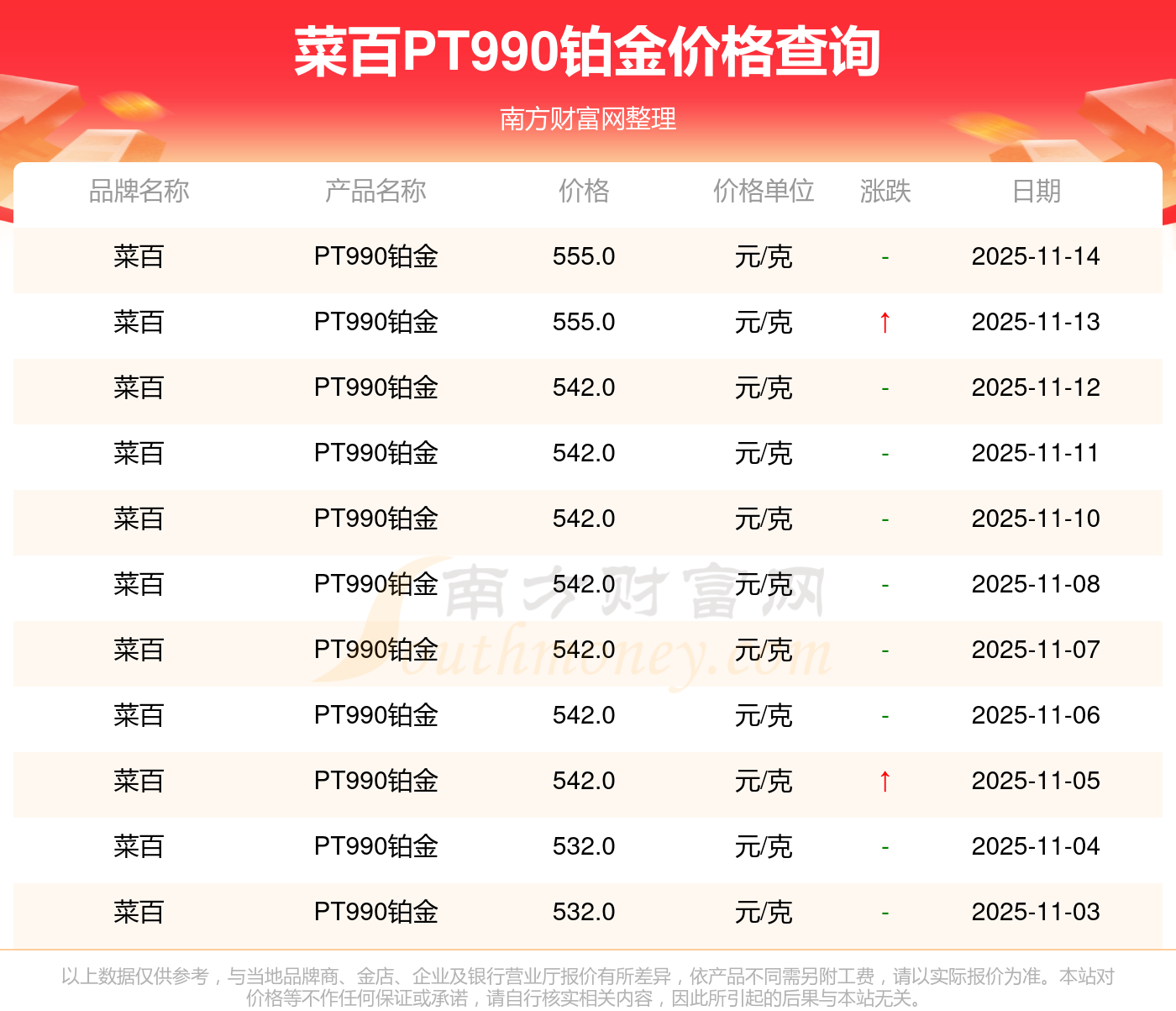 以上数据仅供参考,与当地品牌商、金店、企业及银行营业厅报价有所差异,依产品不同需另附工费,请以实际报价为准。本站对价格等不作任何保证或承诺,请自行核实相关内容,因此所引起的后果与本站无关。