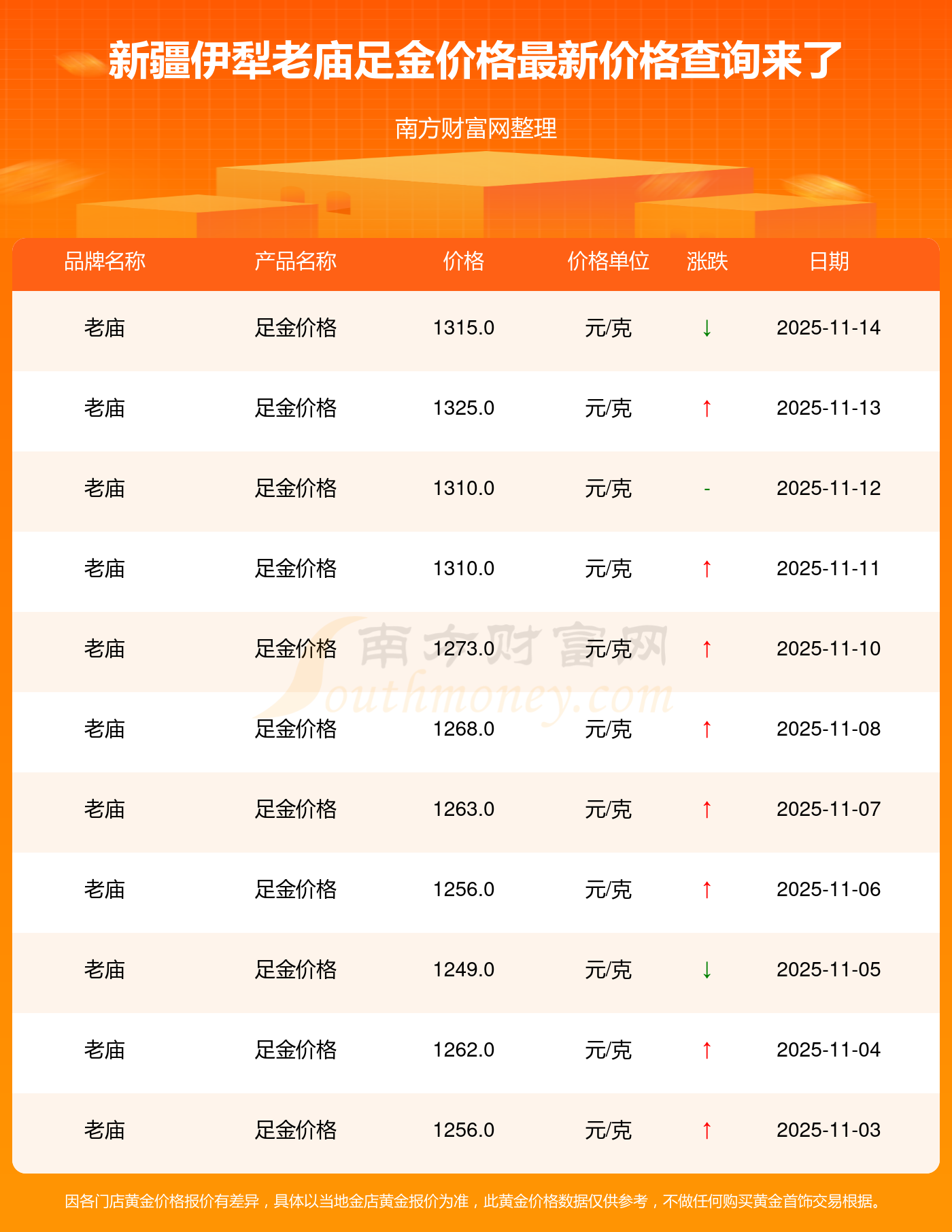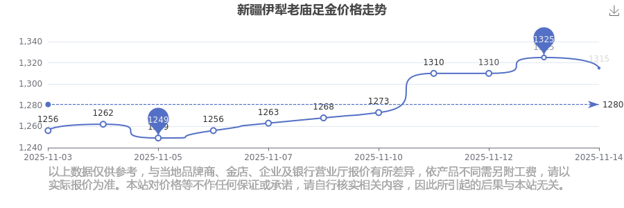 今日(2025年11月15日),新疆伊犁老庙足金价格每克的价值为1315.0元/克。