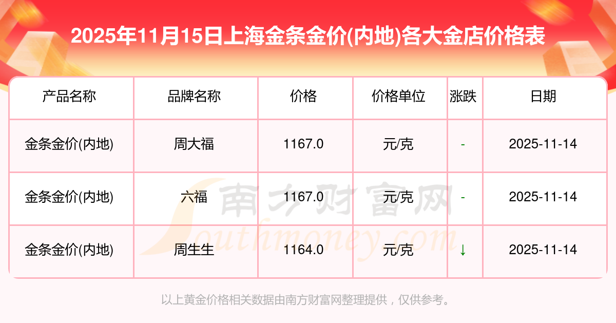 一、上海各大金店金条金价(内地)表,2025年11月15日上海各大金店金条金价(内地)多少钱一克?