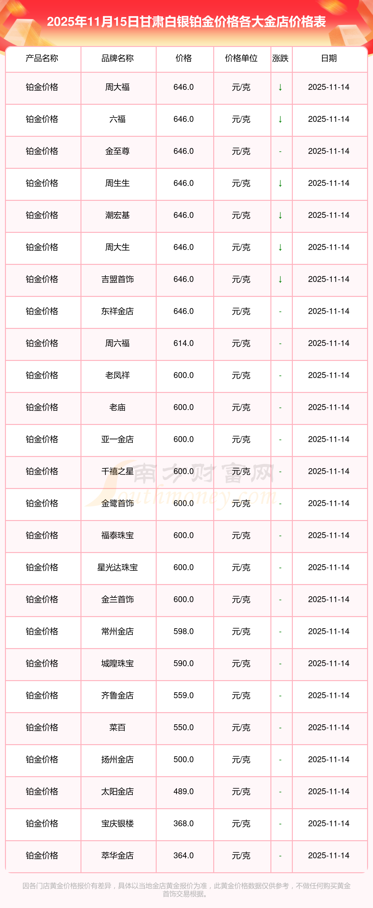 今天黄金价格查询,2025年11月15日甘肃白银各大金店铂金价格表来了