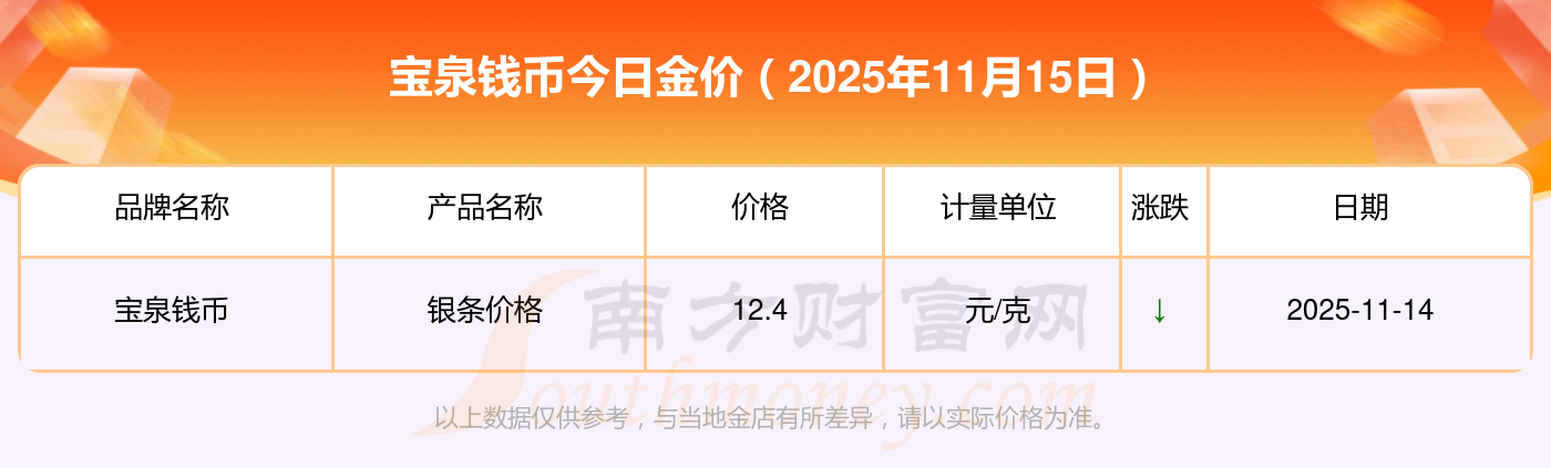 现在宝泉钱币黄金价格是多少钱1克_2025年宝泉钱币今日金价是多少钱一克,最新宝泉钱币查询,2025年11月15日宝泉钱币银条价格现在每克多少钱?最新宝泉钱币银条价格报价公布,一起来看看吧!