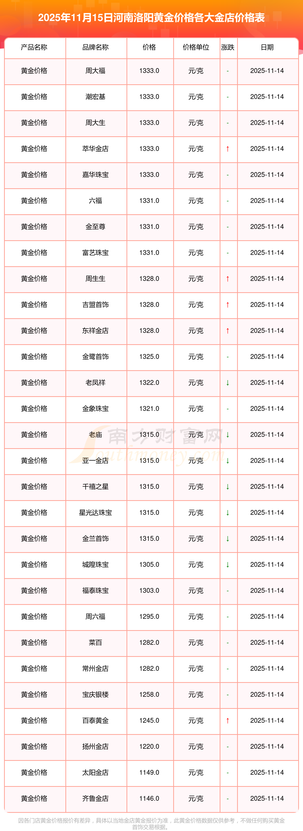 2025年11月15日河南洛阳周大福、周大福、周大福、周大福、周大福、周大福、周大福、老凤祥、老凤祥、老凤祥、周六福等各大金店品牌黄金价格最新价格如下:周大福黄金价格1333.0元/克,周大福铂金价格646.0元/克,周大福饰品金价(内地)1333.0元/克,周大福黄金饰品(香港)46320.0,周大福铂金价格(香港)18410.0,周大福金条价格(香港)41780.0,周大福金条金价(内地)1167.0元/克,老凤祥黄金价格1322.0元/克,老凤祥铂金价格600.0元/克,老凤祥足金价格1322.0元/克,周六福黄金价格1295.0元/克。