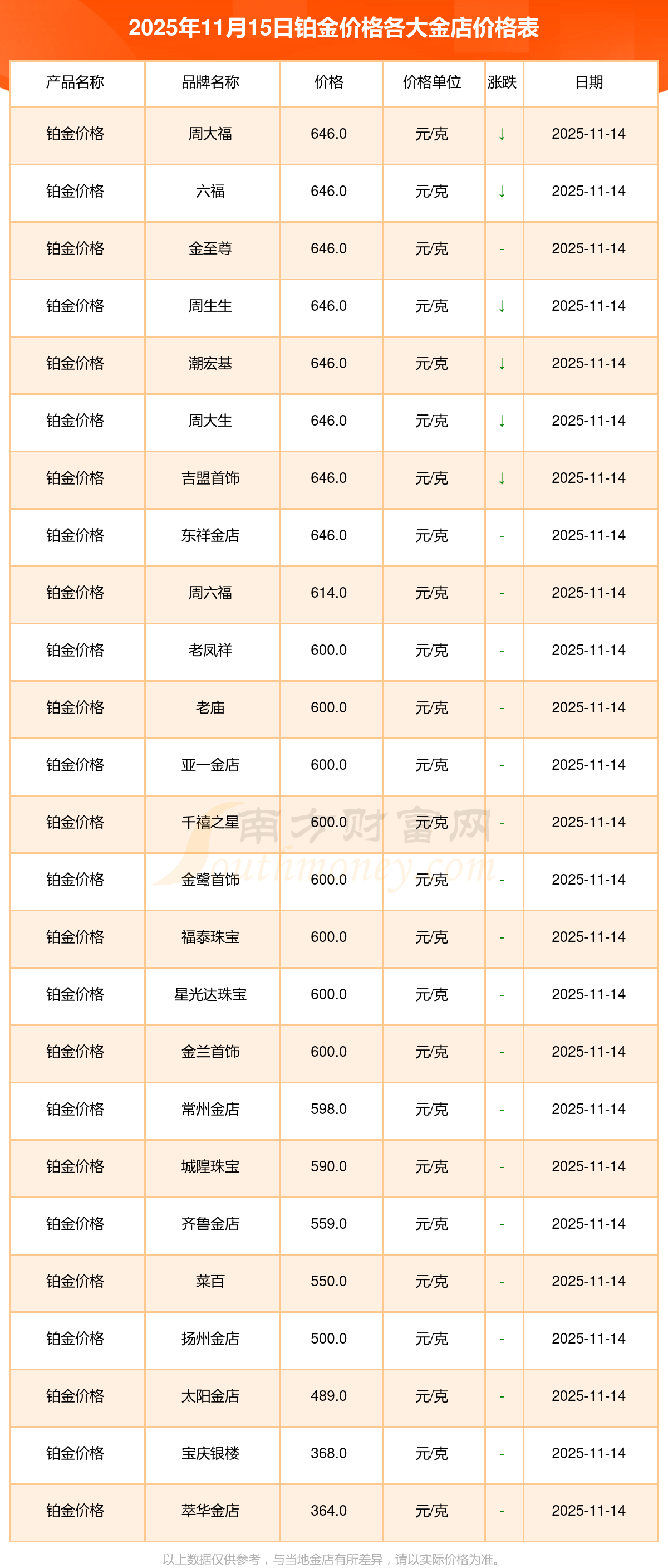 2025年11月15日各大金店铂金价格最新价格:周大福1333.0元/克,周大福646.0元/克,周大福1333.0元/克,周大福46320.0,周大福18410.0,周大福41780.0,周大福1167.0元/克,老凤祥1322.0元/克,老凤祥600.0元/克,老凤祥1322.0元/克,周六福1295.0元/克。