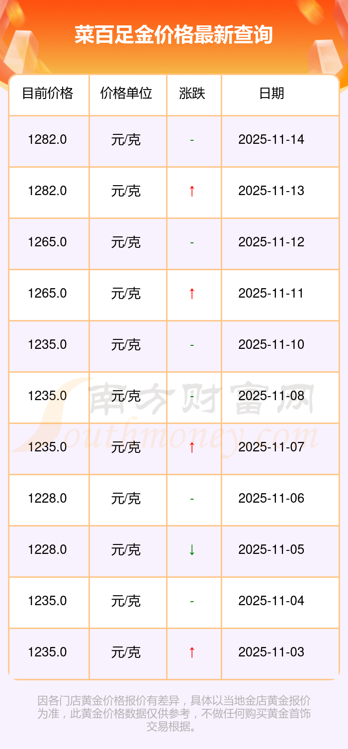 菜百今日足金价格的最新市场行情价为1282.0元/克。
