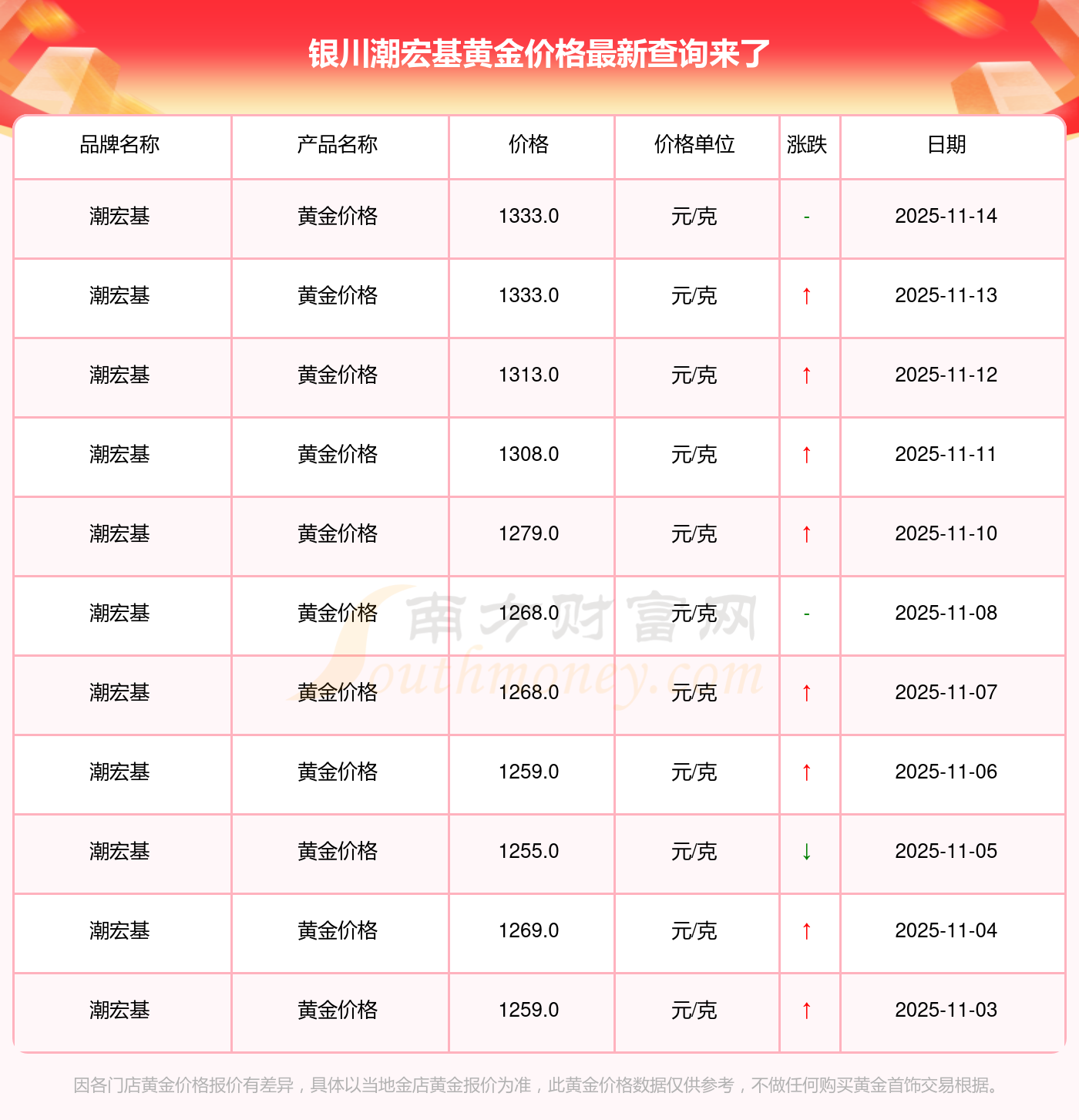 2025年11月15日银川潮宏基黄金价格:1333.0元/克。