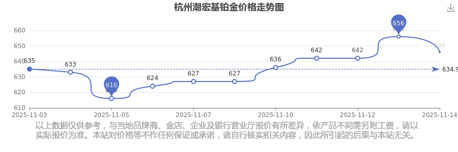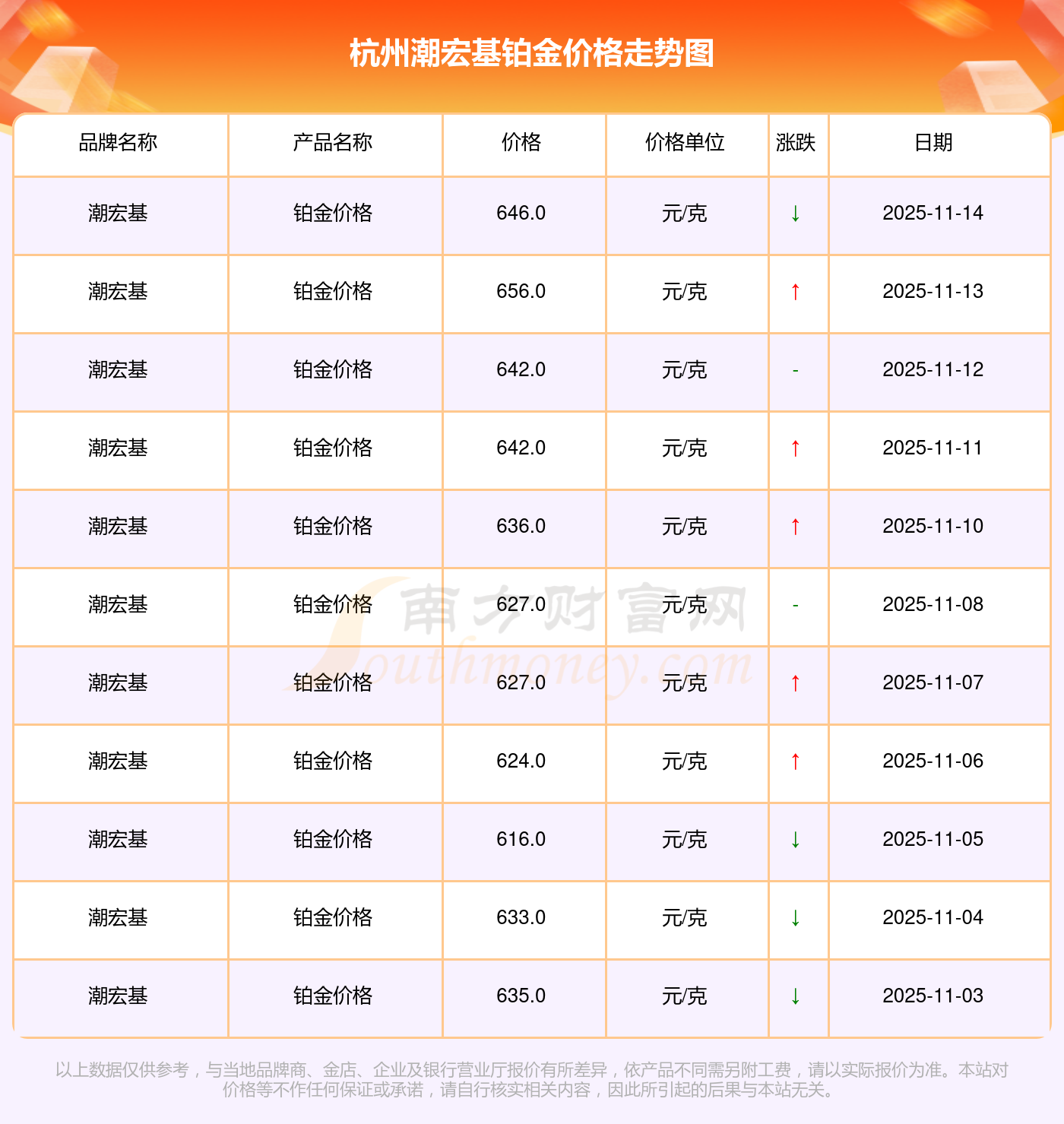 今日(2025年11月15日)杭州潮宏基铂金价格最新价格为646.0元/克。