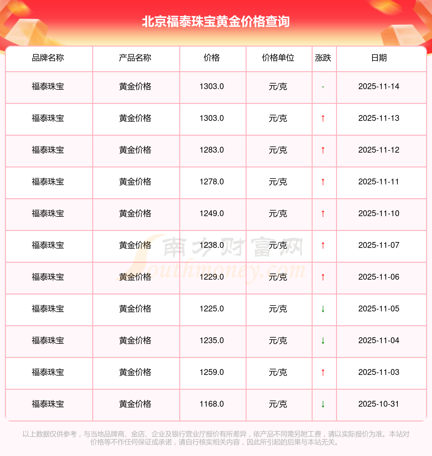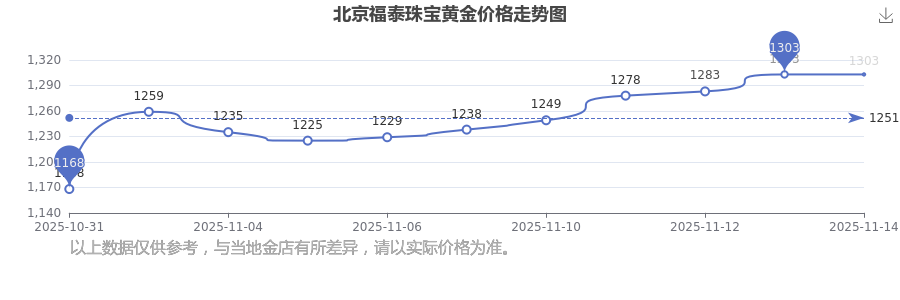 今日(2025年11月15日)北京福泰珠宝黄金价格最新价格为1303.0元/克。