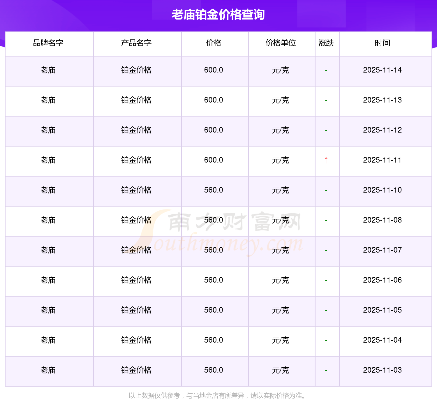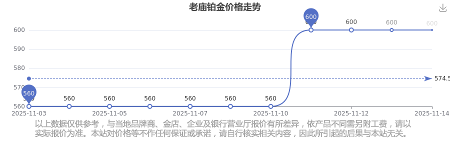 2025年11月15日老庙铂金价格最新为600.0元/克。