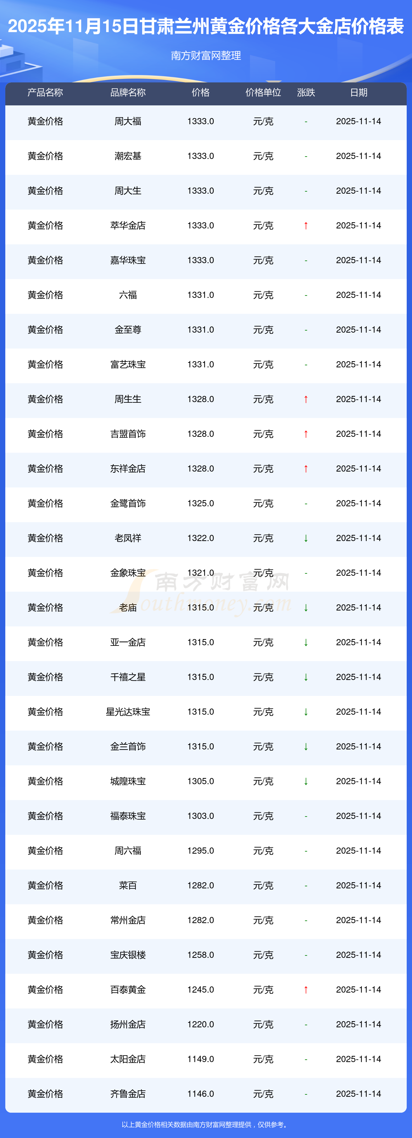 2025年11月15日,甘肃兰州周大福、周大福、周大福、周大福、周大福、周大福、周大福、老凤祥、老凤祥、老凤祥、周六福等各大金店品牌黄金价格今日价格如下:周大福1333.0元/克、周大福646.0元/克、周大福1333.0元/克、周大福46320.0、周大福18410.0、周大福41780.0、周大福1167.0元/克、老凤祥1322.0元/克、老凤祥600.0元/克、老凤祥1322.0元/克、周六福1295.0元/克。