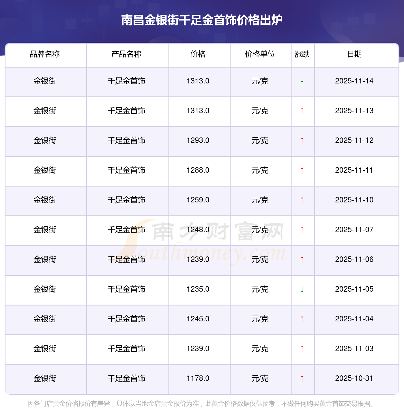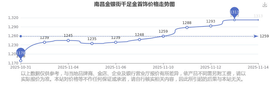 南昌金银街千足金首饰在 2025年11月15日,其市场价格为 1313.0元/克。