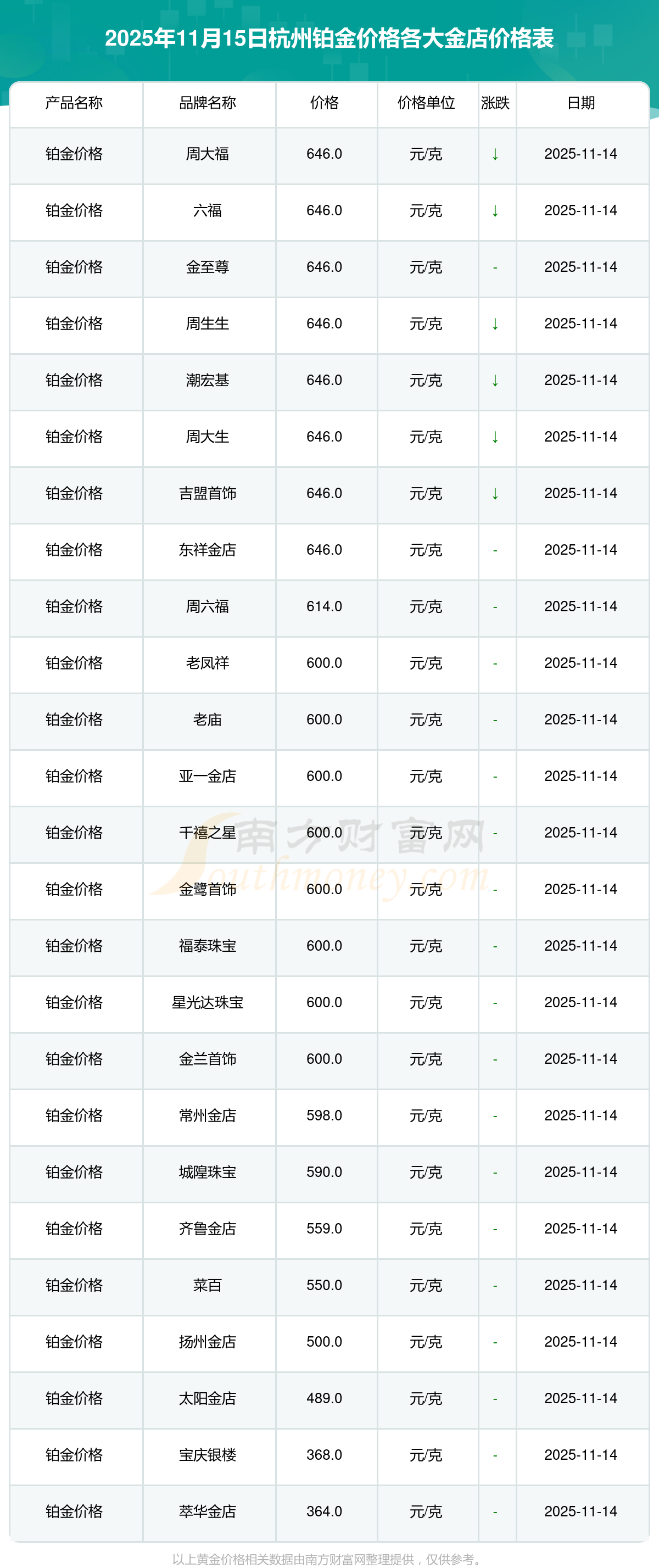 2025年11月15日杭州各大金店铂金价格最新价格查询来了:周大福1333.0元/克,周大福646.0元/克,周大福1333.0元/克,周大福46320.0,周大福18410.0,周大福41780.0,周大福1167.0元/克,老凤祥1322.0元/克,老凤祥600.0元/克,老凤祥1322.0元/克,周六福1295.0元/克。