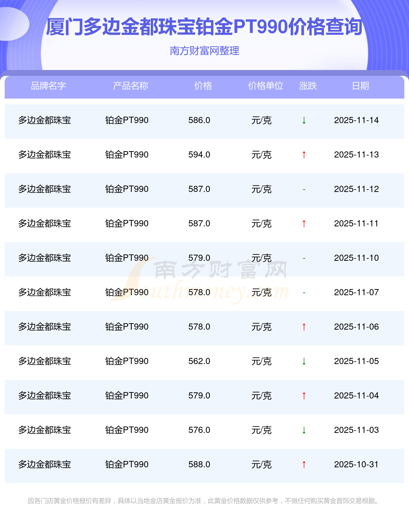 2025年11月15日厦门多边金都珠宝今日铂金PT990多少钱一克,多边金都珠宝今日铂金PT990价格最新报价来了,随小编来了解一下详情。