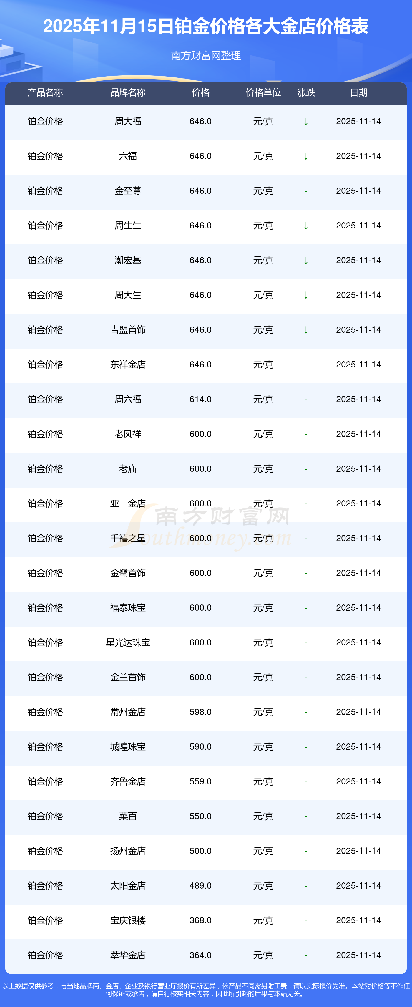 2025年11月15日,周大福、周大福、周大福、周大福、周大福、周大福、周大福、老凤祥、老凤祥、老凤祥、周六福等各大金店品牌铂金价格今日价格如下:周大福1333.0元/克、周大福646.0元/克、周大福1333.0元/克、周大福46320.0、周大福18410.0、周大福41780.0、周大福1167.0元/克、老凤祥1322.0元/克、老凤祥600.0元/克、老凤祥1322.0元/克、周六福1295.0元/克。