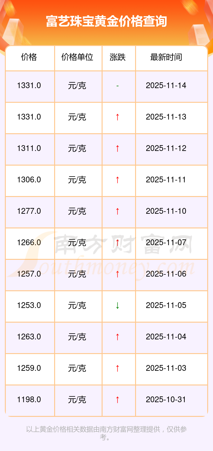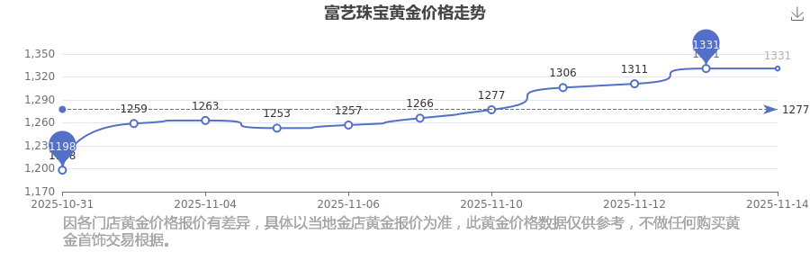 今日富艺珠宝黄金价格最新为1331.0元/克。