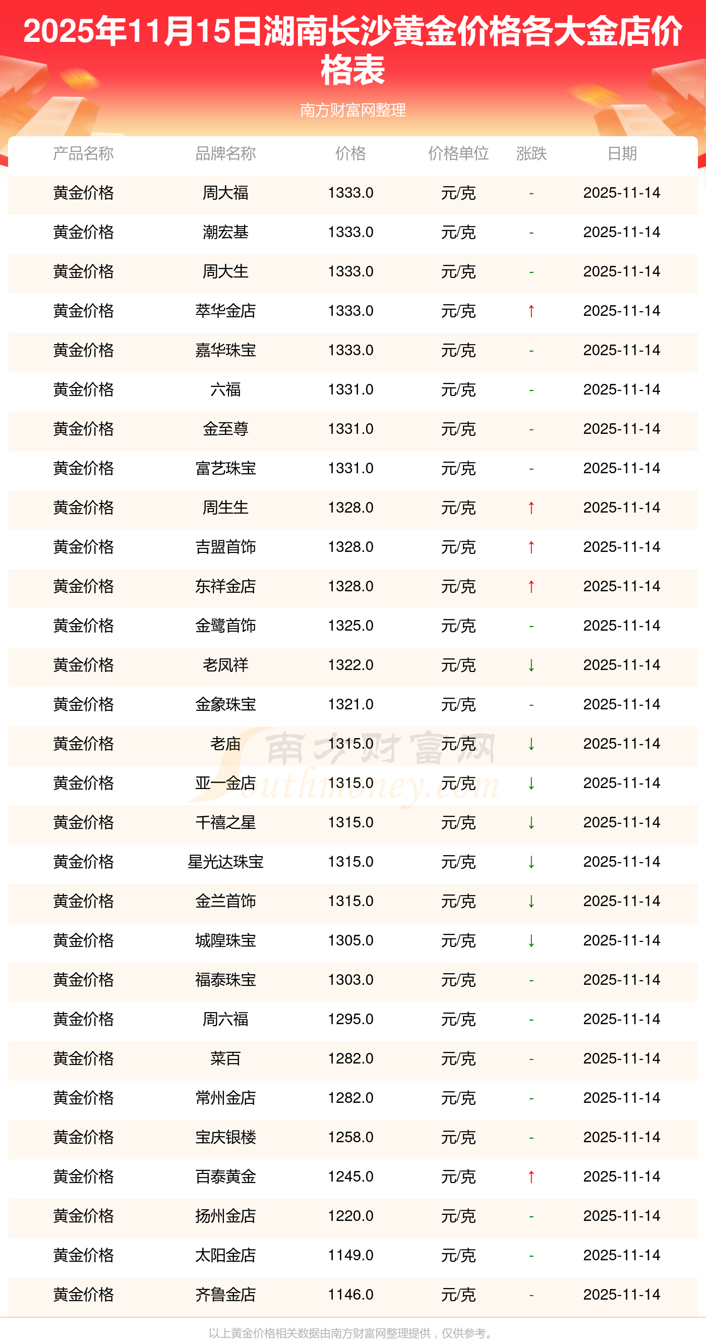 今天是2025年11月15日,湖南长沙周大福、周大福、周大福、周大福、周大福、周大福、周大福、老凤祥、老凤祥、老凤祥、周六福等各大金店品牌黄金价格最新价格行情是这样的:周大福1333.0元/克、周大福646.0元/克、周大福1333.0元/克、周大福46320.0、周大福18410.0、周大福41780.0、周大福1167.0元/克、老凤祥1322.0元/克、老凤祥600.0元/克、老凤祥1322.0元/克、周六福1295.0元/克。