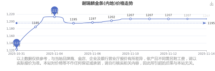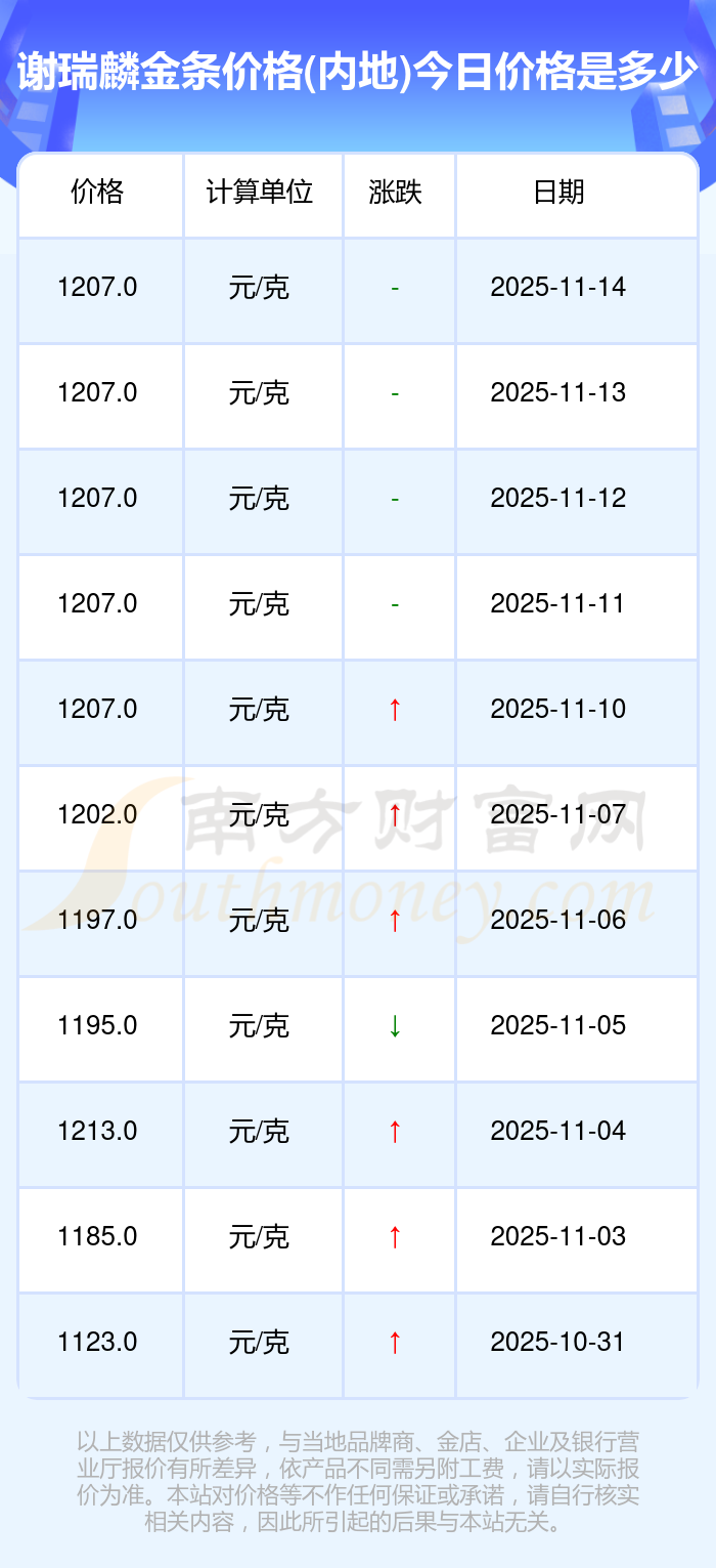 据了解,今日谢瑞麟 金条价格(内地)的最新价格为1207.0元/克。