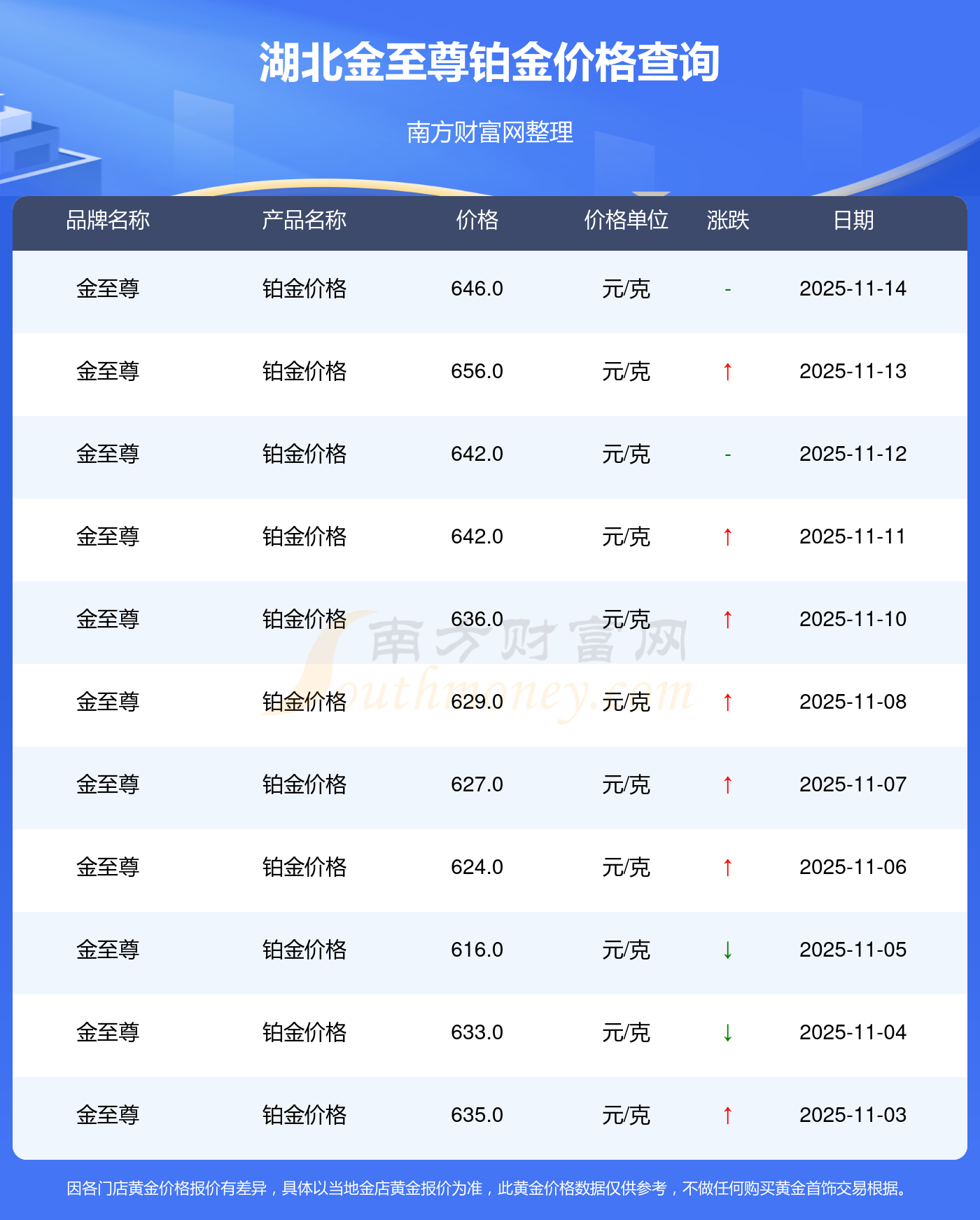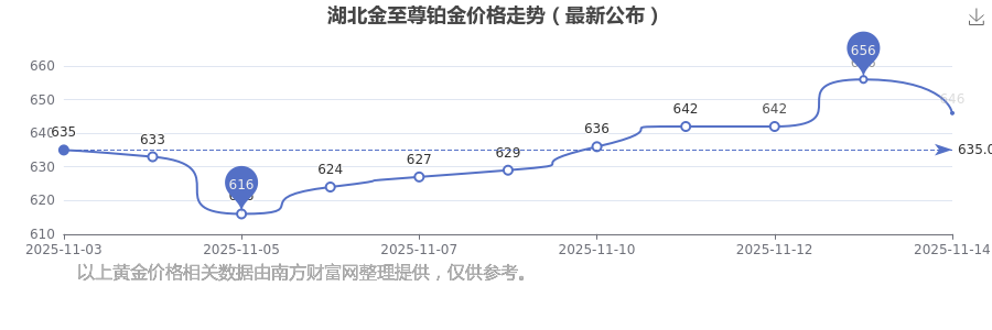 2025年11月15日,湖北金至尊铂金价格每克的价值量定格在646.0元/克。