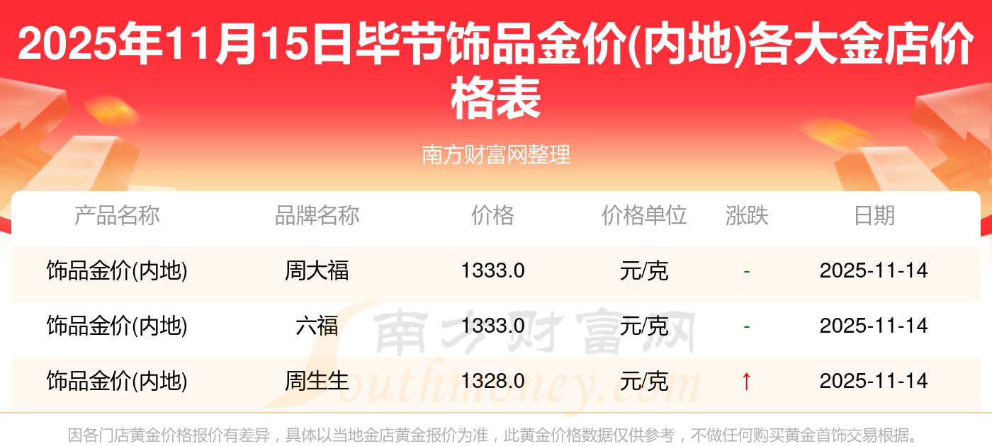 今天是2025年11月15日,毕节周大福、周大福、周大福、周大福、周大福、周大福、周大福、老凤祥、老凤祥、老凤祥、周六福等各大金店品牌饰品金价(内地)最新价格行情是这样的:周大福1333.0元/克、周大福646.0元/克、周大福1333.0元/克、周大福46320.0、周大福18410.0、周大福41780.0、周大福1167.0元/克、老凤祥1322.0元/克、老凤祥600.0元/克、老凤祥1322.0元/克、周六福1295.0元/克。