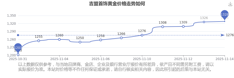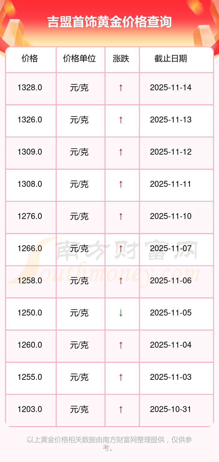 吉盟首饰今日黄金价格的最新市场行情价为1328.0元/克。