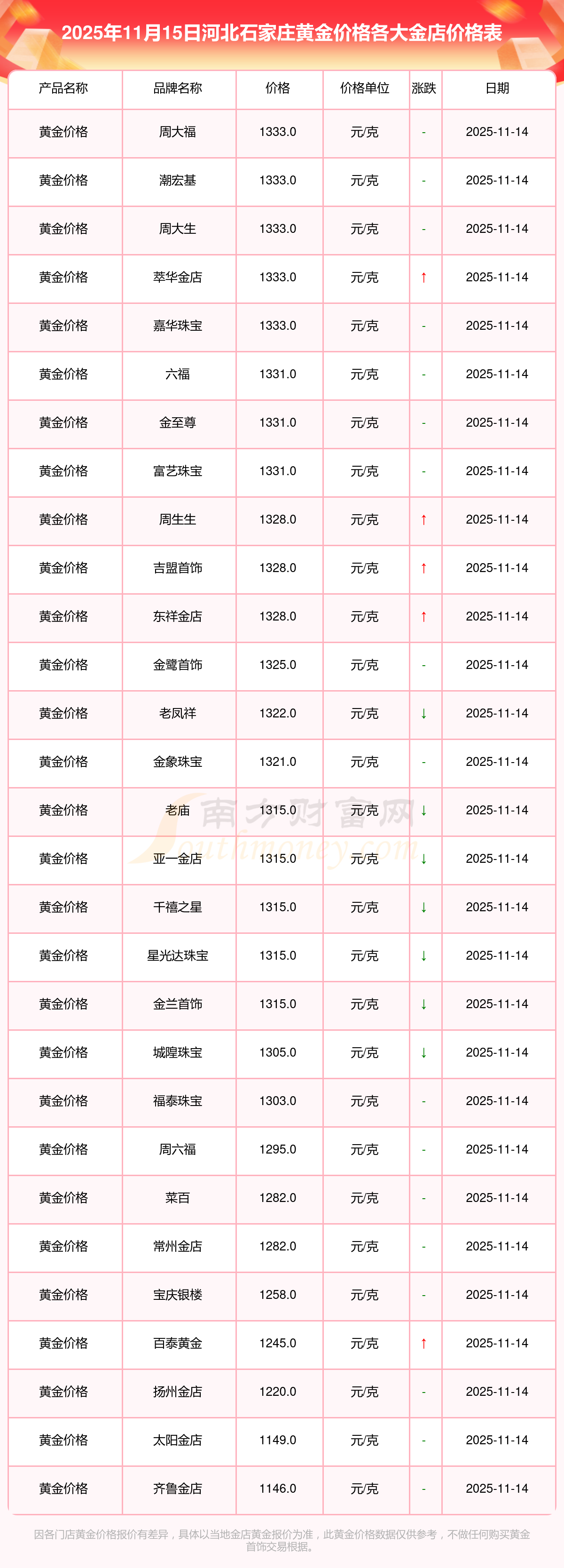 今天是2025年11月15日,河北石家庄周大福、周大福、周大福、周大福、周大福、周大福、周大福、老凤祥、老凤祥、老凤祥、周六福等各大金店品牌黄金价格最新价格如下:周大福1333.0元/克、周大福646.0元/克、周大福1333.0元/克、周大福46320.0、周大福18410.0、周大福41780.0、周大福1167.0元/克、老凤祥1322.0元/克、老凤祥600.0元/克、老凤祥1322.0元/克、周六福1295.0元/克。