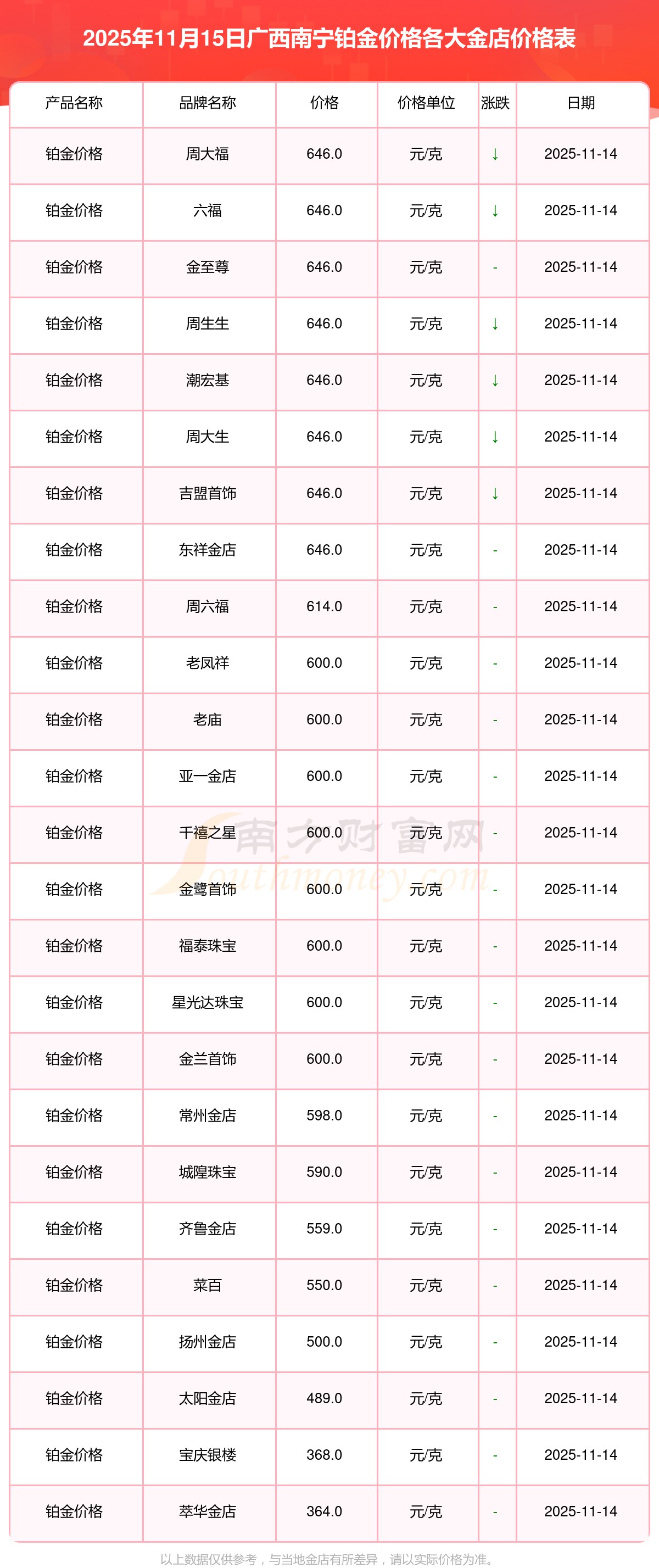 2025年11月15日广西南宁周大福、周大福、周大福、周大福、周大福、周大福、周大福、老凤祥、老凤祥、老凤祥、周六福等各大金店品牌铂金价格最新价格如下:周大福黄金价格1333.0元/克,周大福铂金价格646.0元/克,周大福饰品金价(内地)1333.0元/克,周大福黄金饰品(香港)46320.0,周大福铂金价格(香港)18410.0,周大福金条价格(香港)41780.0,周大福金条金价(内地)1167.0元/克,老凤祥黄金价格1322.0元/克,老凤祥铂金价格600.0元/克,老凤祥足金价格1322.0元/克,周六福黄金价格1295.0元/克。