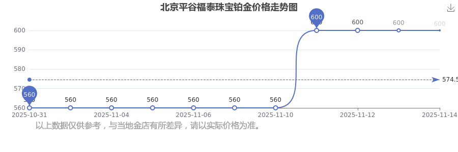 今日(2025年11月15日),北京平谷福泰珠宝铂金价格每克的价值为600.0元/克。