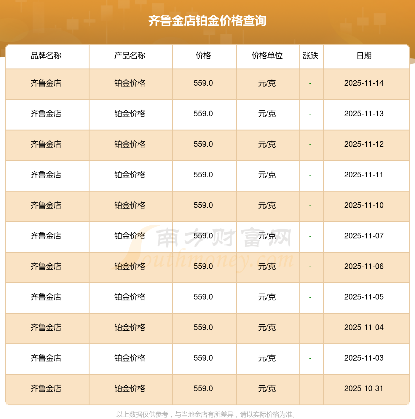 齐鲁金店今日 铂金价格的最新市场行情价为559.0元/克。