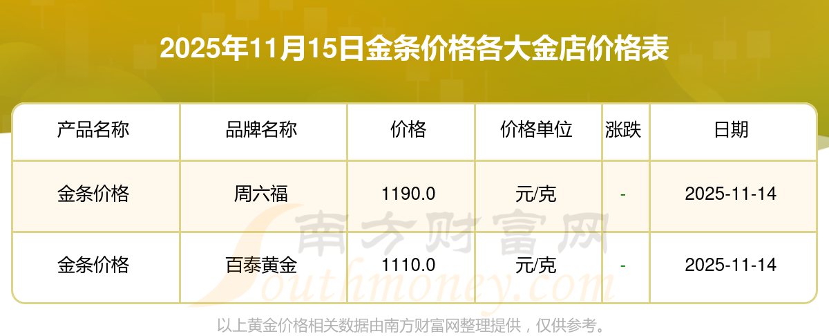 今天是2025年11月15日,周大福、周大福、周大福、周大福、周大福、周大福、周大福、老凤祥、老凤祥、老凤祥、周六福等各大金店品牌金条价格最新价格如下:周大福1333.0元/克、周大福646.0元/克、周大福1333.0元/克、周大福46320.0、周大福18410.0、周大福41780.0、周大福1167.0元/克、老凤祥1322.0元/克、老凤祥600.0元/克、老凤祥1322.0元/克、周六福1295.0元/克。