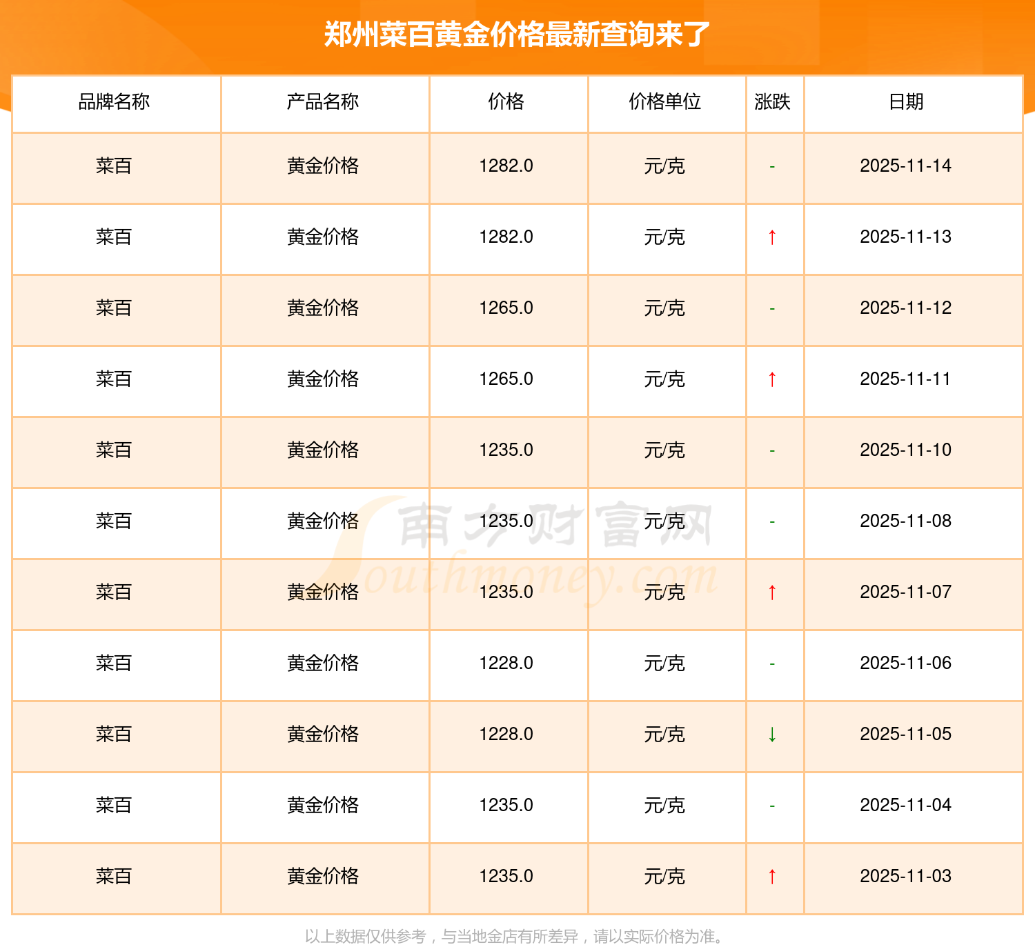 2025年11月15日,今日郑州菜百黄金价格:1282.0元/克。