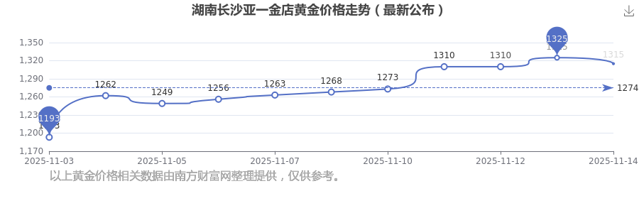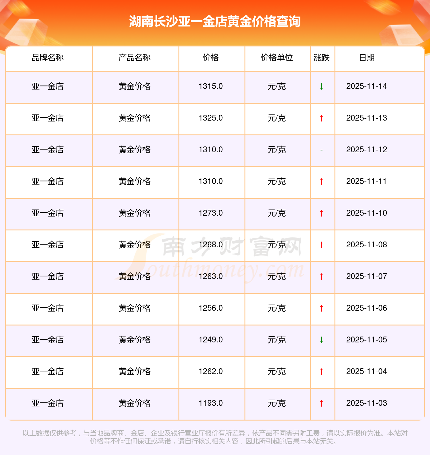 今日(2025年11月15日),1315.0元/克是湖南长沙亚一金店黄金价格的价格标准。