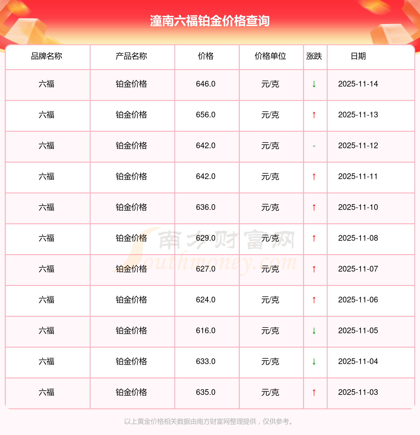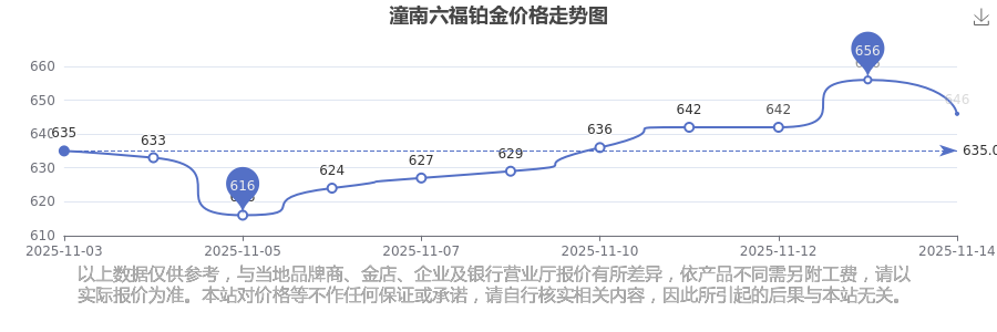 今日(2025年11月15日)潼南六福铂金价格是646.0元/克。