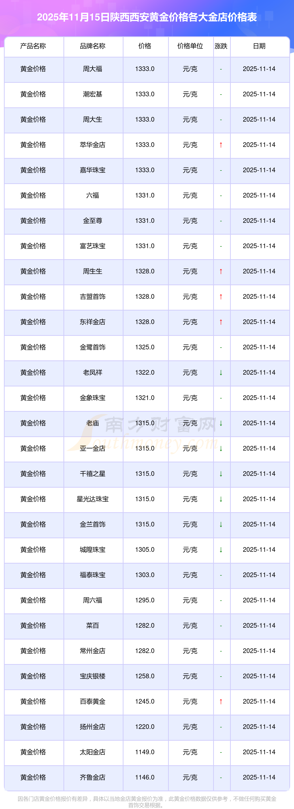 2025年11月15日陕西西安周大福、周大福、周大福、周大福、周大福、周大福、周大福、老凤祥、老凤祥、老凤祥、周六福等各大金店品牌黄金价格最新价格行情来了,如下:周大福黄金价格1333.0元/克,周大福铂金价格646.0元/克,周大福饰品金价(内地)1333.0元/克,周大福黄金饰品(香港)46320.0,周大福铂金价格(香港)18410.0,周大福金条价格(香港)41780.0,周大福金条金价(内地)1167.0元/克,老凤祥黄金价格1322.0元/克,老凤祥铂金价格600.0元/克,老凤祥足金价格1322.0元/克,周六福黄金价格1295.0元/克。