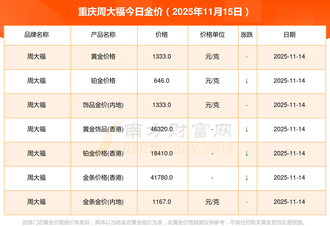 黄金价格1333.0元/克,铂金价格646.0元/克,饰品金价(内地)1333.0元/克,黄金饰品(香港)46320.0,铂金价格(香港)18410.0,金条价格(香港)41780.0,金条金价(内地)1167.0元/克,黄金价格1322.0元/克,铂金价格600.0元/克,足金价格1322.0元/克,黄金价格1295.0元/克。