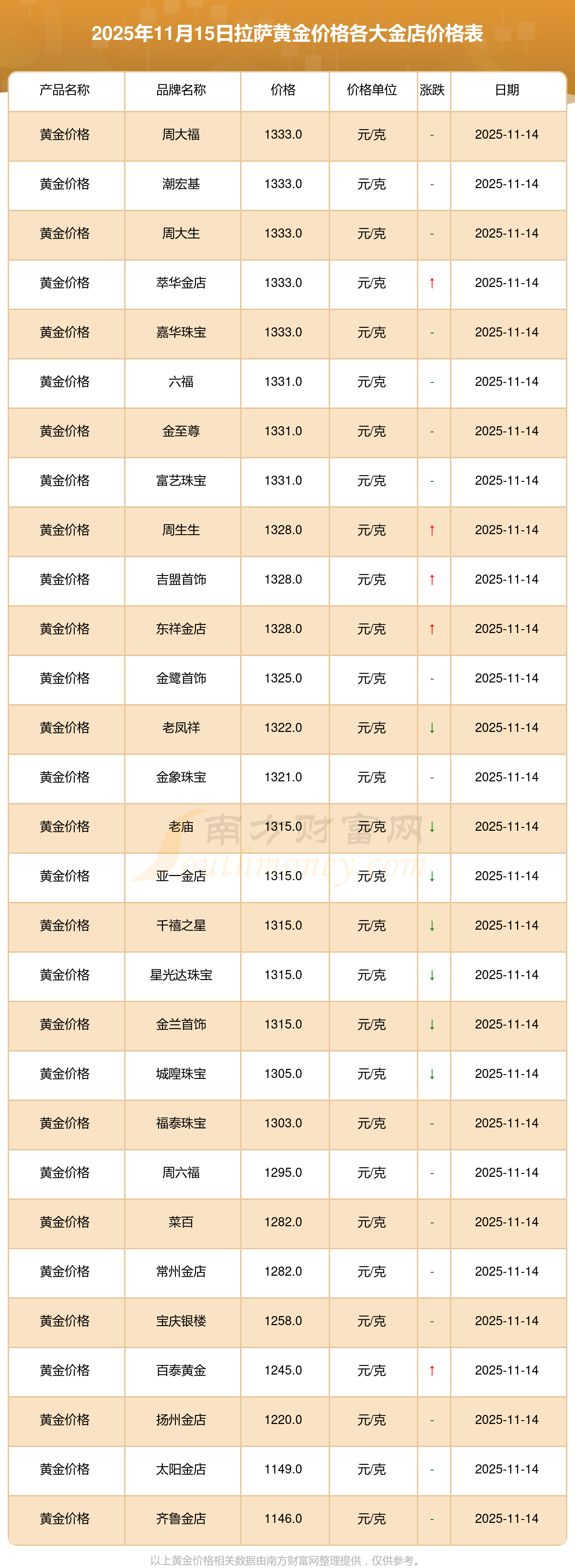 2025年11月15日拉萨周大福、周大福、周大福、周大福、周大福、周大福、周大福、老凤祥、老凤祥、老凤祥、周六福等各大金店品牌黄金价格最新价格行情来了,如下:周大福黄金价格1333.0元/克,周大福铂金价格646.0元/克,周大福饰品金价(内地)1333.0元/克,周大福黄金饰品(香港)46320.0,周大福铂金价格(香港)18410.0,周大福金条价格(香港)41780.0,周大福金条金价(内地)1167.0元/克,老凤祥黄金价格1322.0元/克,老凤祥铂金价格600.0元/克,老凤祥足金价格1322.0元/克,周六福黄金价格1295.0元/克。