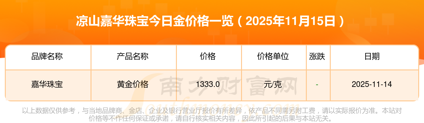 今日黄金价格查询_现在金价黄金一克多少钱,黄金价格是多少钱一克?2025年11月15日凉山嘉华珠宝现在购买一克黄金需要支付多少钱?黄金价格1333.0元/克,铂金价格646.0元/克,饰品金价(内地)1333.0元/克,黄金饰品(香港)46320.0,铂金价格(香港)18410.0,金条价格(香港)41780.0,金条金价(内地)1167.0元/克,黄金价格1322.0元/克,铂金价格600.0元/克,足金价格1322.0元/克,黄金价格1295.0元/克。