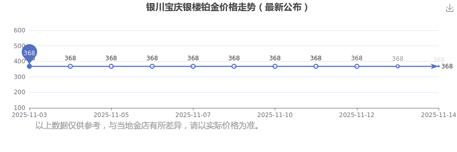 今日(2025年11月15日),银川宝庆银楼铂金价格:368.0元/克。