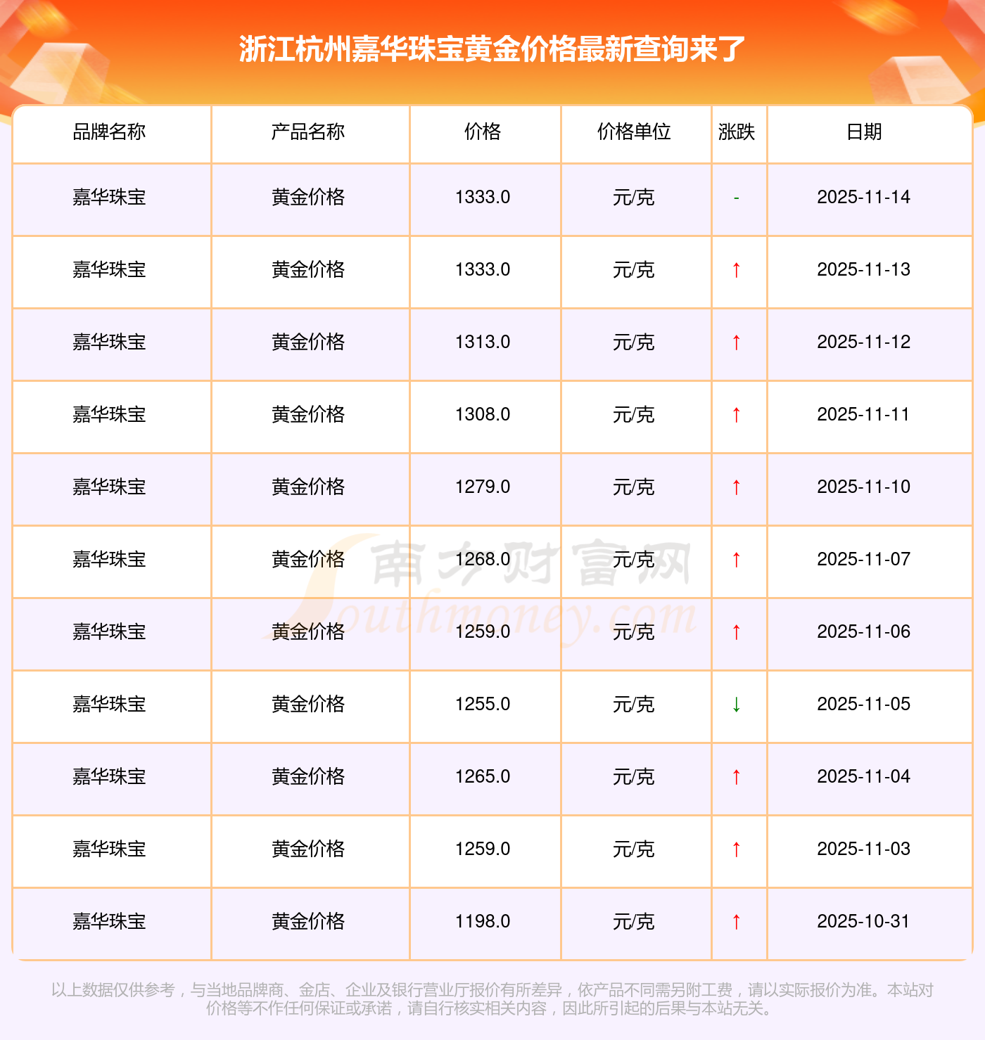 2025年11月15日周大福、周大福、周大福、周大福、周大福、周大福、周大福、老凤祥、老凤祥、老凤祥、周六福等各大金店品牌黄金价格最新价格如下:周大福黄金价格1333.0元/克,周大福铂金价格646.0元/克,周大福饰品金价(内地)1333.0元/克,周大福黄金饰品(香港)46320.0,周大福铂金价格(香港)18410.0,周大福金条价格(香港)41780.0,周大福金条金价(内地)1167.0元/克,老凤祥黄金价格1322.0元/克,老凤祥铂金价格600.0元/克,老凤祥足金价格1322.0元/克,周六福黄金价格1295.0元/克。