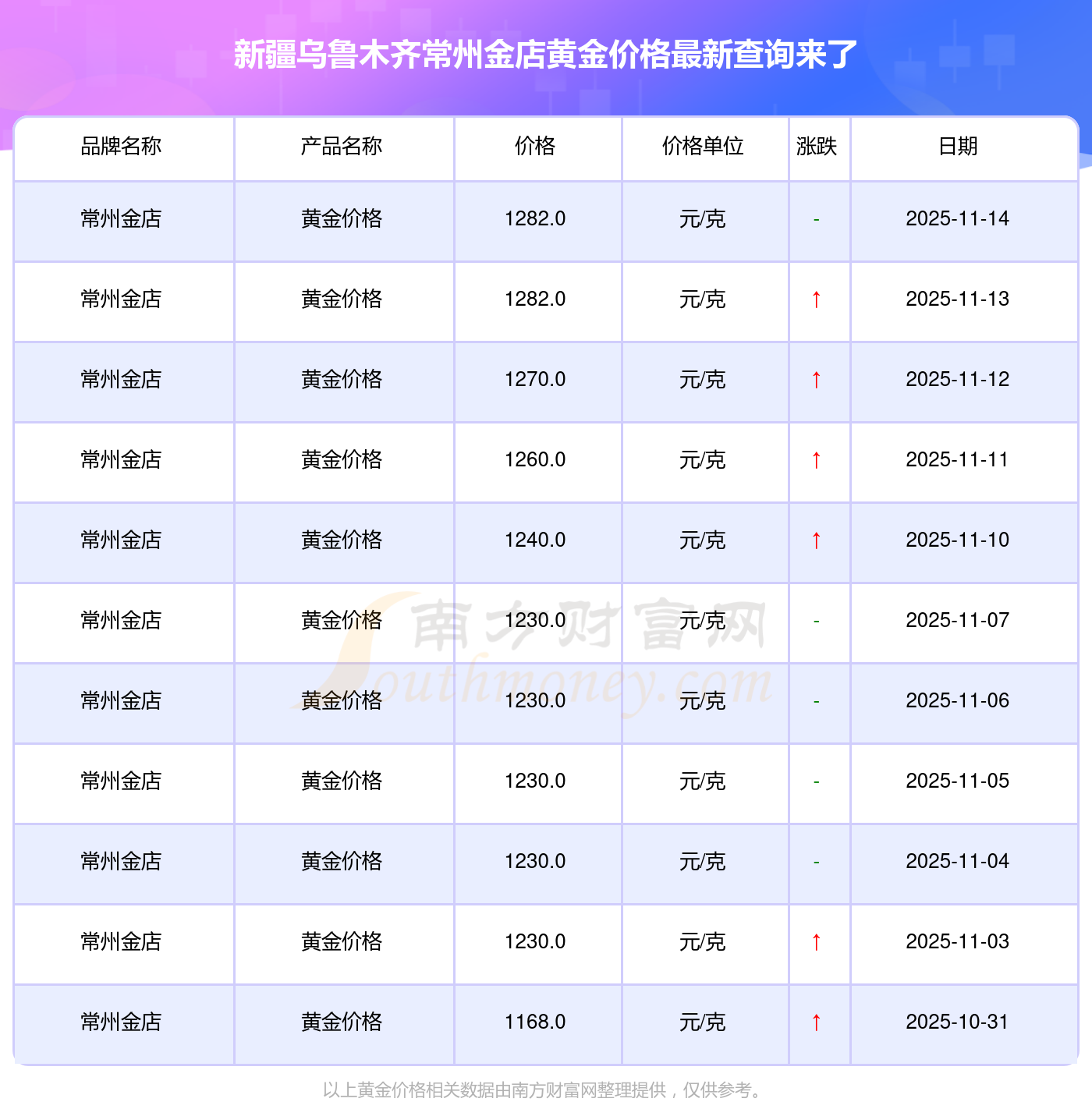 今日新疆乌鲁木齐常州金店黄金价格公布今日每克黄金的价值是多少1282.0元/克的黄金价格,是新疆乌鲁木齐常州金店在 2025年11月15日给出的。
