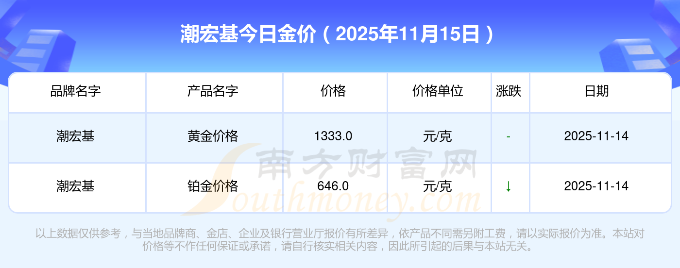 2025年11月15日周大福、周大福、周大福、周大福、周大福、周大福、周大福、老凤祥、老凤祥、老凤祥、周六福等各大金店品牌黄金价格最新价格如下:周大福黄金价格1333.0元/克,周大福铂金价格646.0元/克,周大福饰品金价(内地)1333.0元/克,周大福黄金饰品(香港)46320.0,周大福铂金价格(香港)18410.0,周大福金条价格(香港)41780.0,周大福金条金价(内地)1167.0元/克,老凤祥黄金价格1322.0元/克,老凤祥铂金价格600.0元/克,老凤祥足金价格1322.0元/克,周六福黄金价格1295.0元/克。