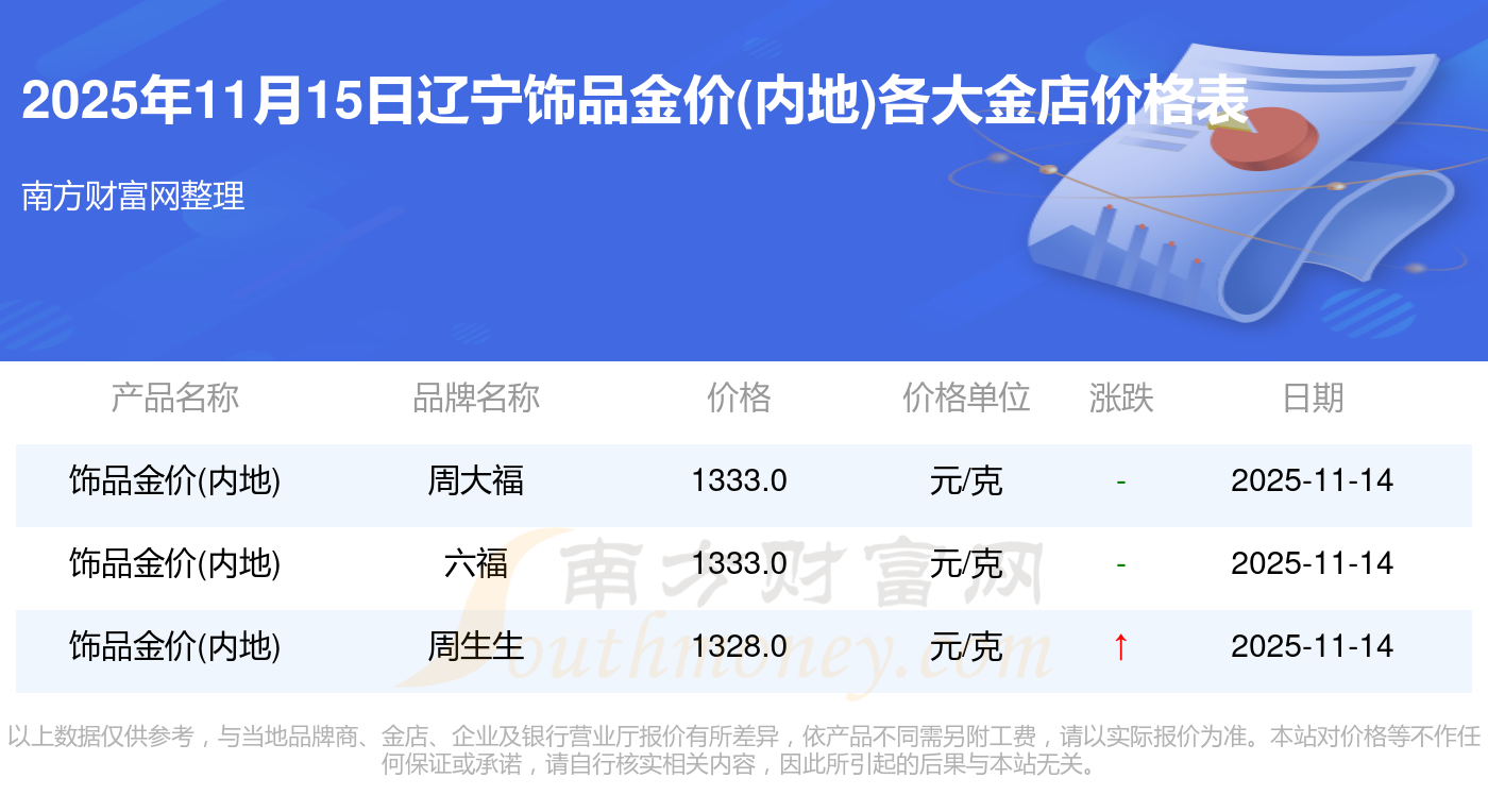 2025年11月15日辽宁周大福、周大福、周大福、周大福、周大福、周大福、周大福、老凤祥、老凤祥、老凤祥、周六福等各大金店品牌饰品金价(内地)最新价格如下:周大福黄金价格1333.0元/克,周大福铂金价格646.0元/克,周大福饰品金价(内地)1333.0元/克,周大福黄金饰品(香港)46320.0,周大福铂金价格(香港)18410.0,周大福金条价格(香港)41780.0,周大福金条金价(内地)1167.0元/克,老凤祥黄金价格1322.0元/克,老凤祥铂金价格600.0元/克,老凤祥足金价格1322.0元/克,周六福黄金价格1295.0元/克。